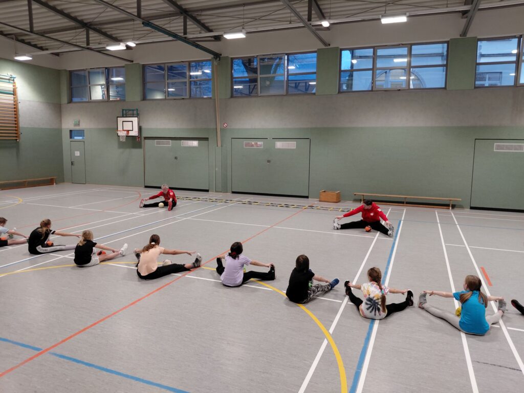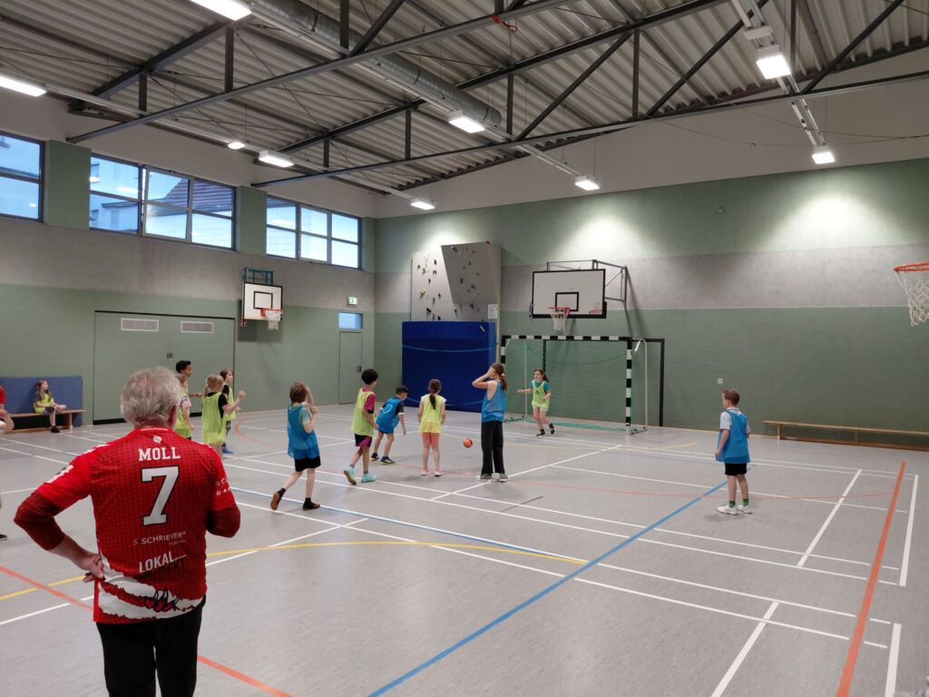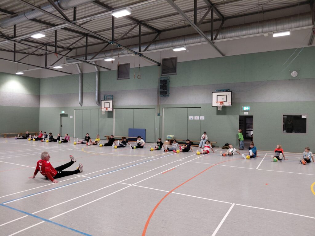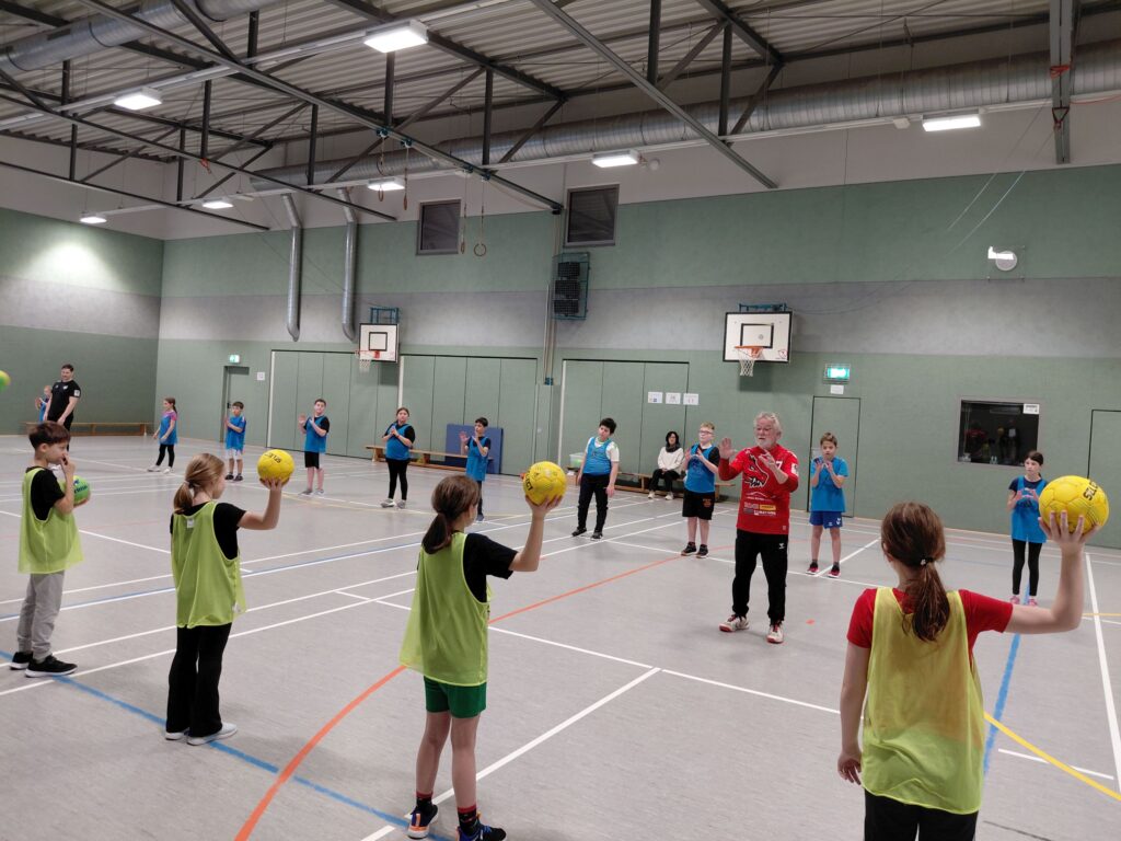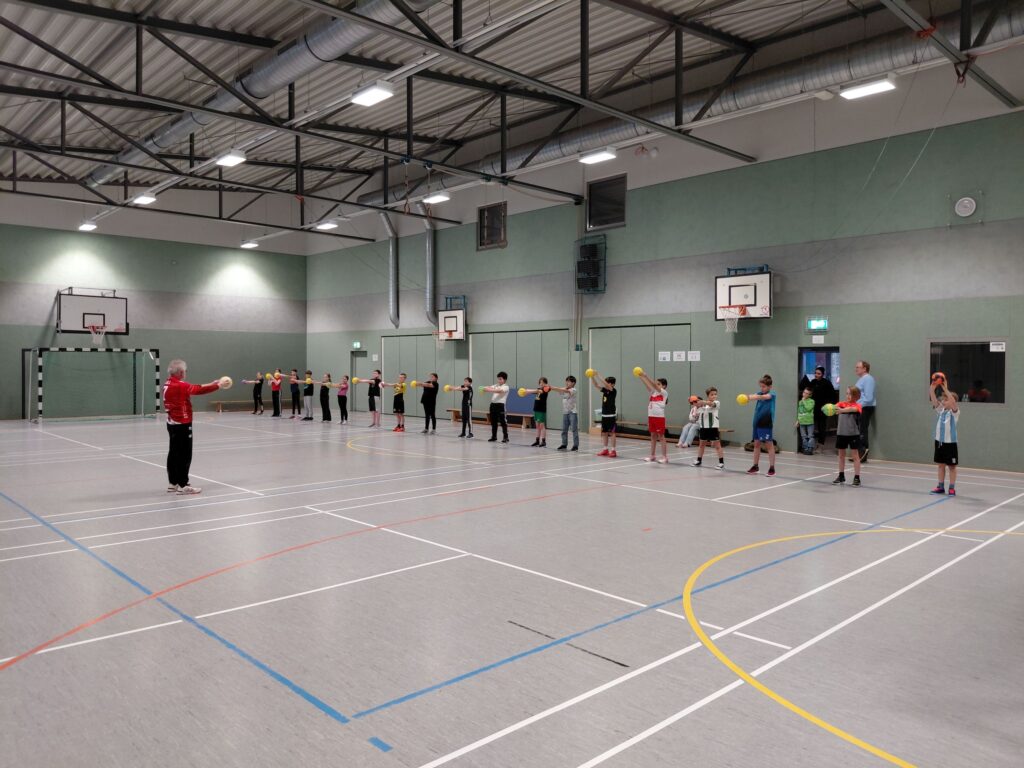 An diesem Tag boten die Vertreter des Handballvereins SGSH (Dragons) in Zusammenarbeit mit dem Deutschen Handballbund eine Handballübungseinheit an, an der alle Kinder der Jahrgangsstufe 4 teilnehmen durften. 50 interessierte Kinder kamen gespannt mit ihren Sportsachen in die Turnhalle.